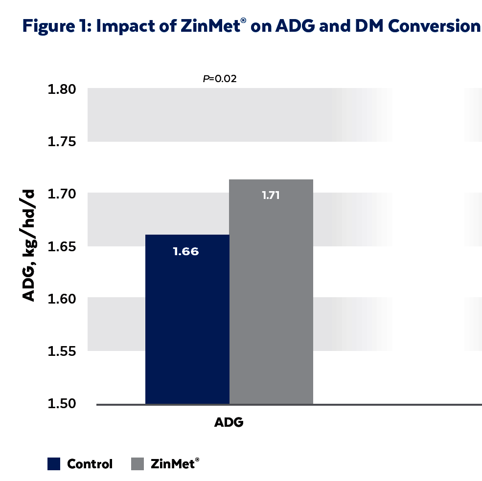 Between 2002 - 2009, five independent feedlot trials were conducted by Global Animal Products across 51 replicates with a total of 1,329 beef cattle. In each trial, ZinMet replaced Zinc at the recommended feeding level to assess its impact on finishing cattle performance. ZinMet’s unique combination of Zinc, Chromium and Methionine was proven to bypass rumen degradation at an enhanced rate of 80%, making it more readily available through the gastrointestinal tract.